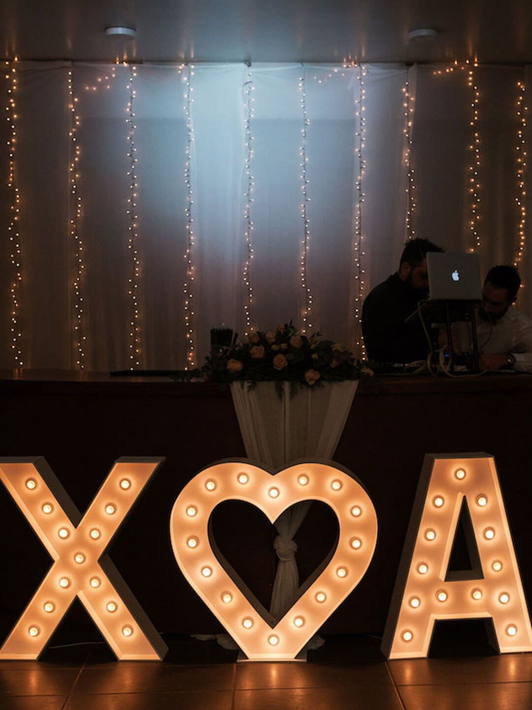 We use specialized warm-white LED bulbs that create a soft, warm glow and look beautiful in both photos and videos. Our letters are fully wireless, with hidden cabling and sturdy bases, ensuring a clean and safe setup at all times. They can be placed anywhere—from beaches and gardens to elegant indoor venues—while remaining stable even in typical Greek summer conditions.
